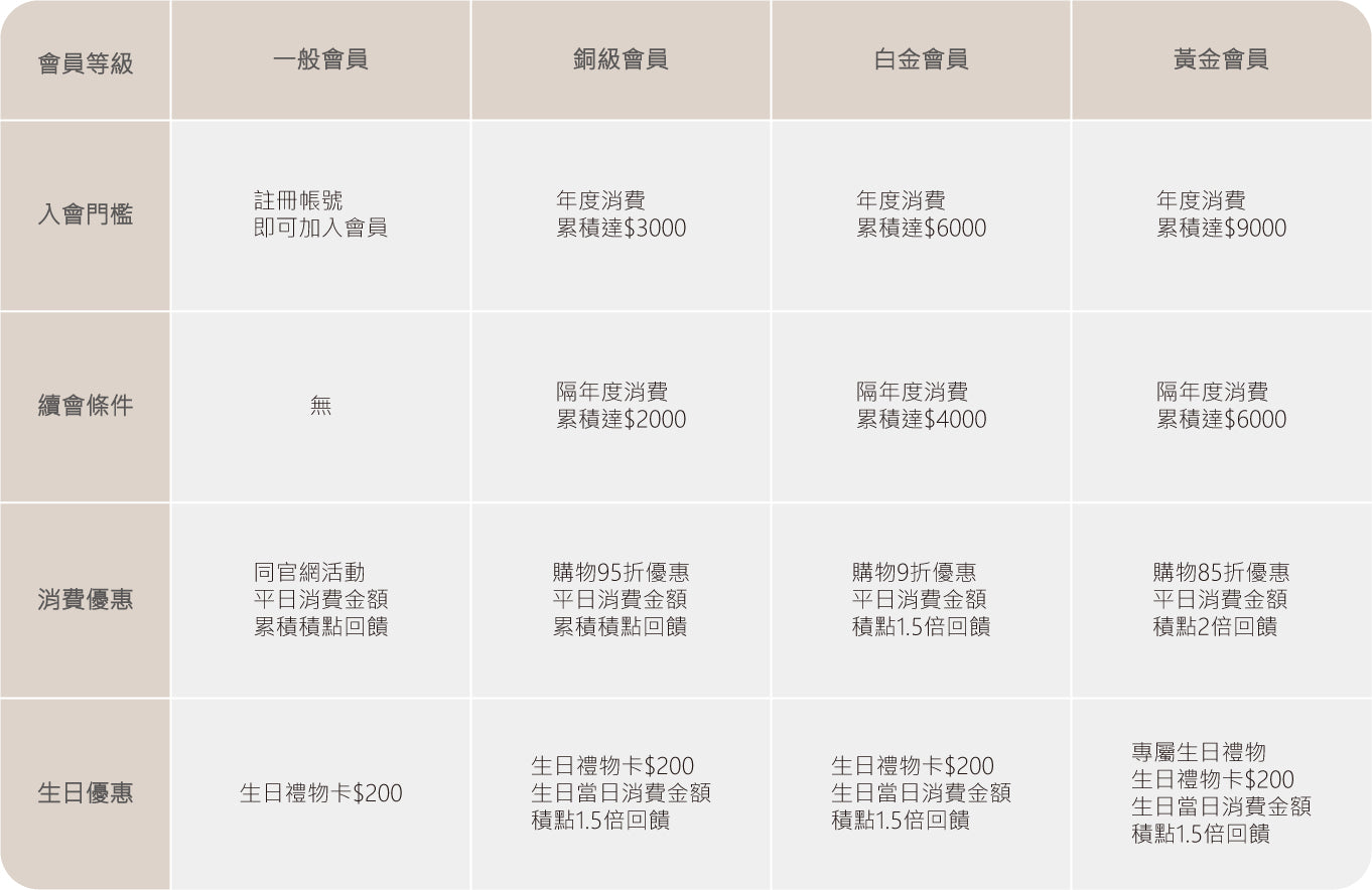 ※會員升級不同等級時金額計算方式:於每日結算前一天回推一年間累積實際消費金額,若有符合資格,將於隔日更新於會員